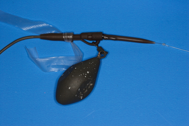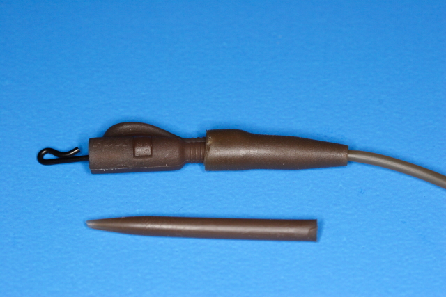 The above picture shows the “business end” of the lead clip and the anti tangle sleeve. It is worth pointing out that the tubing is only pushed into the back of the tail rubber and does not need glue. If you glue it, the rubber will become brittle and the tubing will snap ruining the rig. Before you can use if for the 1st time you will need to dissable it to be able to tie the mainline on to the back of the kwick change swivel.