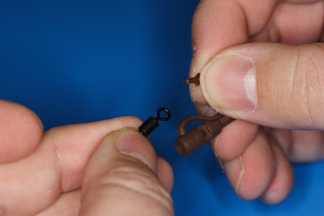Once this is done, the next step is to replace the little plastic peg. Pull the mainline firmly to pull the swivel back inside the lead clip and once it is back in place properly ( it should virtually disappear back in side) push the little plastic peg back in :