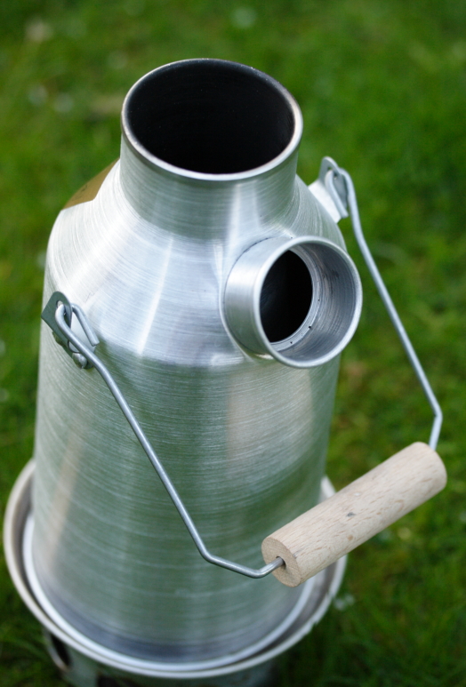 As you can see there is a base at the bottom with air holes and a chimney unit on top that has a cork stopper. To use you simply fill the kettle with water through the spout on the right hand side, and light a small fire in the base ie