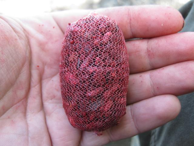 How could a carp resist that ? I also decided to keep with the Meteor theme and use some meteor boilies on the hair that had been wallowing in meteor liquid for several weeks to toughen them up and impart vital flavour. This technique has been really successful in the Amsterdamse Bos to the last few years and I was full on confidence. On retrieving one of the boilies from the water I decided to see just how far the glug had penetrated in the last few weeks :