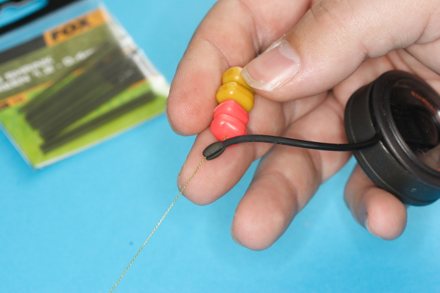 Next using a baiting needle put on your bait, in this case 3 pieces of floating corn and place a fox popup weight on the hair underneath them. I prefer to use the Fox popup weights as they don’t tend to come off on the cast like standard BB shot often does.