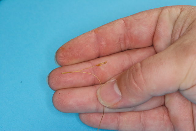 Now using your baiting needle, put on a bait of the same size that you will be using ( note you don’t need to put on a bait stop as the bait will be off in a minute) and match up where you want the ring to sit. On a Fox SSC you want the ring to be just after the 1st bend in the shank about 3/4 down.