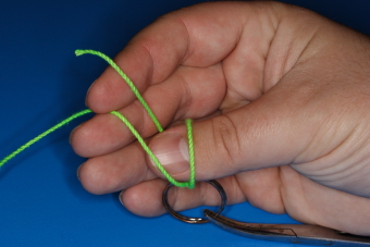 I find it easier to place my thumb through the loop formed by passing the line twice through the eye.