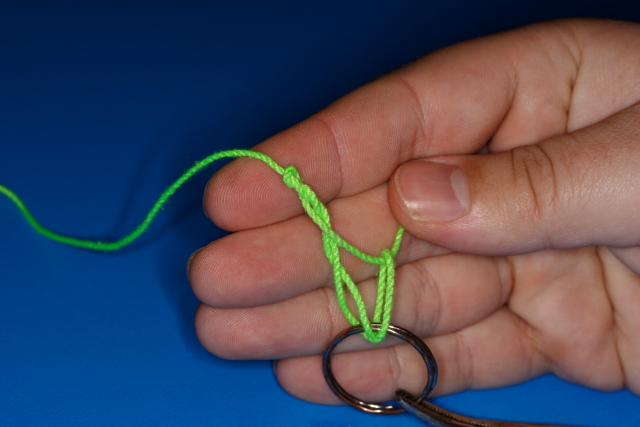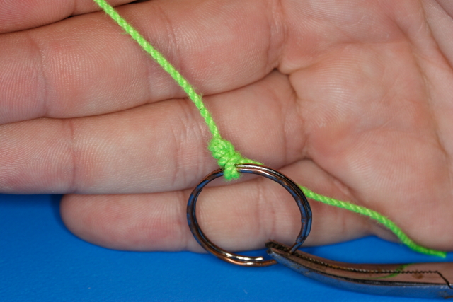 Please note that I am tying this knot with luminous string to make it easier and am tying to a large ring just for the sake of illustration.