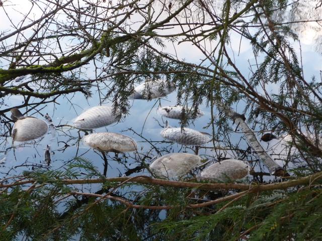 Hundreds and hundreds of dead carp. When Marcel popped round to the other part of Bos to check the main pool he was greeted by an even more grizzly sight. What he thought were white birds popping up on the water were carp, bream and other fish dead as far as the eye can see.